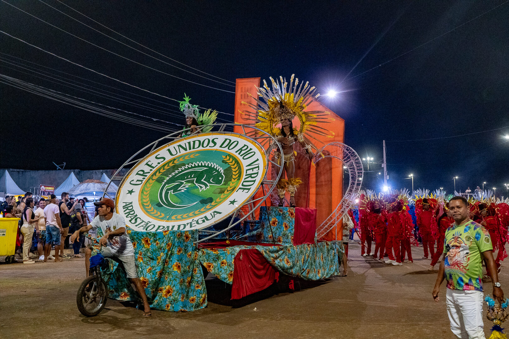 Abrindo os desfiles, a Unidos do Rio Verde Arrastão Pai d’Égua apresentou o enredo “Parintins: A Ilha da Magia – Dois Corações, Uma Só Paixão”, celebrando a cultura amazônica. O vice-presidente Robson Lima destacou a expectativa da agremiação. “A gente vai fazer um desfile lindo, com todos os elementos que costumamos trazer: samba no pé, alegria e fantasia”.