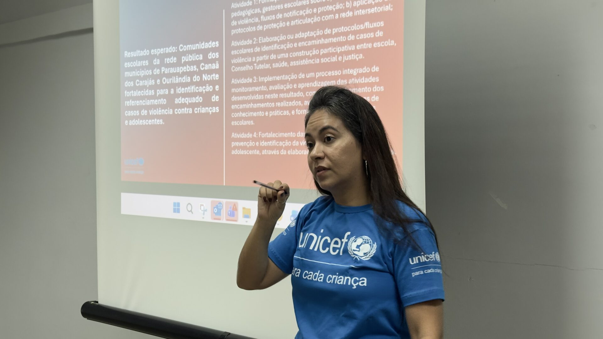 A reunião contou com a participação da consultora de Educação e Proteção da Criança e do Adolescente do UNICEF, Nayana Goes, que apresentou uma nova frente de atuação a ser desenvolvida nos municípios de Parauapebas, Canaã dos Carajás e Ourilândia do Norte. A iniciativa tem como foco a prevenção e o enfrentamento de diferentes formas de violência, incluindo física, sexual e psicológica.