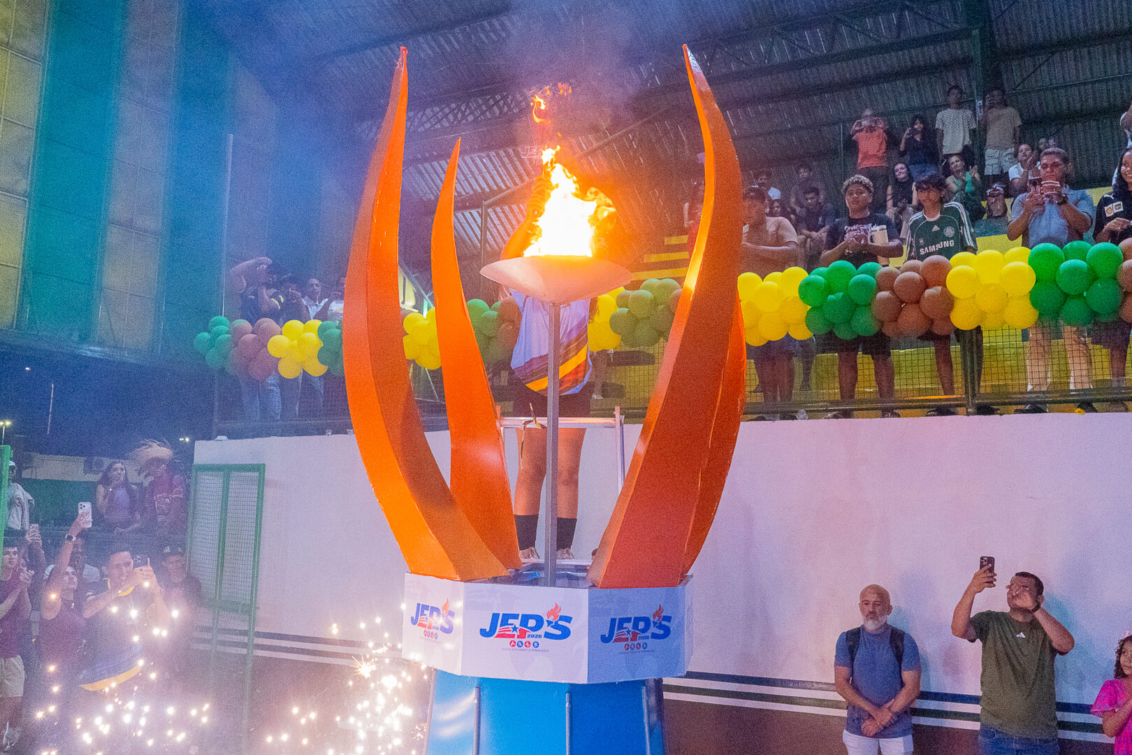 Um dos momentos mais aguardados da noite foi o acendimento da pira olímpica. A estudante Marry Kayapo, do município de Redenção, conduziu a tocha e a entregou à aluna Iara Maria Leite, da Escola Cecília Meireles, responsável por acender a pira, simbolizando o início oficial das competições e o espírito esportivo que move o evento.